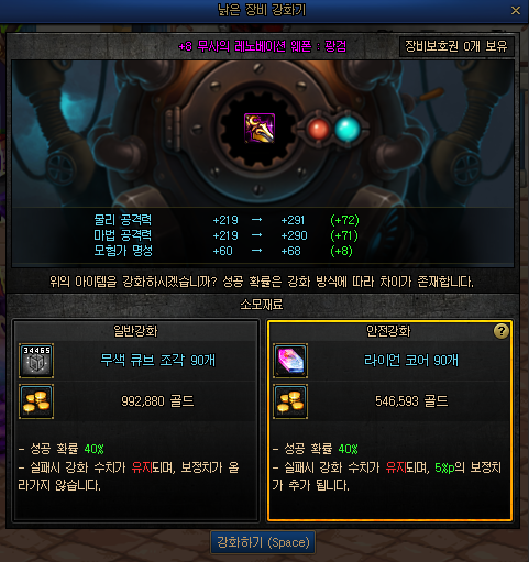 에픽장비를 모으면서 같이 모인 라이언코어로 장비강화(재련)를 진행합니다.
