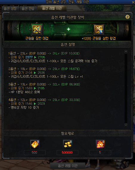 광검(오른쪽)이 가지고 있는 옵션레벨을 대검(왼쪽)에게 그대로 옮기는 형식입니다.